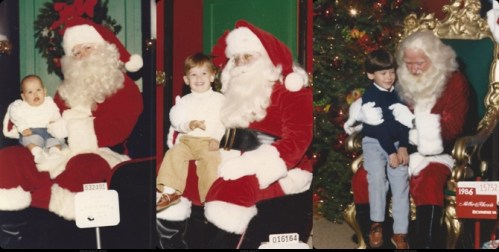When Marshall was a little boy, we had planned to have his picture taken each year with Santa. His first Christmas, he was 6 months old, so no problem there. The following Christmas, at eighteen months, was THE problem. Sadly, in those pre-digital days, we received a notice in the mail that there was a problem with the film, so there was no picture. At that point, we didn’t want to put him (or us) through that trauma a second time. The next Christmas, at age two and a half, all was good. The picture on the far right was taken during a first-grade trip to see the ‘real’ Santa at Miller & Rhoads in Richmond, Va.