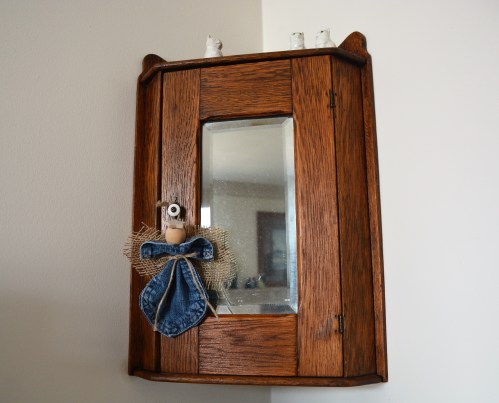 My angel resides year-round on the door of this old mini corner cupboard in our living room.