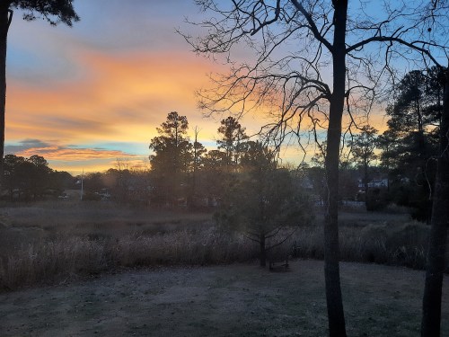 When you wake up, look outside and see everything bathed in a pinky-orange light, you head to your easternmost window for a better view. In this case, it would be one of our bedroom windows.