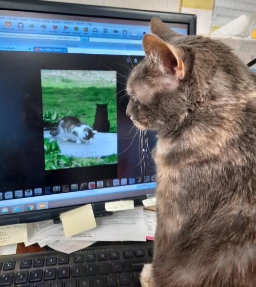 Gypsy, enjoying a FB video of my friend, Donna’s, kitties. Note the paws on the keyboard: I think she sent them a friend request.