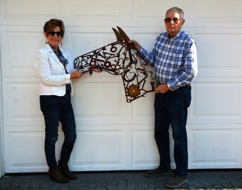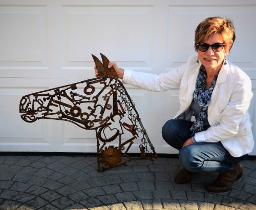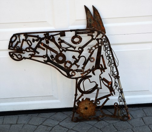 We found this amazing work of art at an antique shop recently. I just love all the elements that were used to create it. It’s especially interesting considering that Motor Man is an engine builder. There are wrenches, nuts, bolts, S-hooks, pliers, part of a hacksaw blade, rebar, a clamp that once held an automotive u-joint in place, a padlock, wood (drill) bit and bolts made into a heart (how appropriate is THAT?). And I love that the heart is placed within the horseshoe. A length of chain was used to create the mane. Motor Man wanted me to be sure to point out the ‘eye’, which is made of two halves of something (we aren’t sure what) welded together.