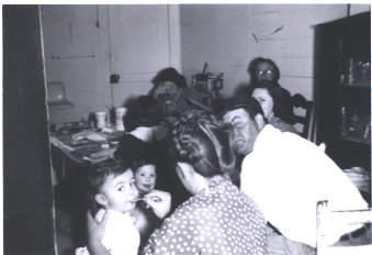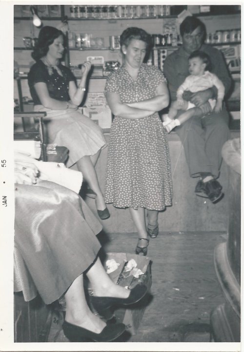The building may now be gone, but I have a few family photos from both inside and outside the store. In this first one, family members are gathered around Grandma’s kitchen table. My grandmother is in the background. To her left is the china cabinet that my dad had made for her, which now has a place of honor in our dining room. Others in the picture are my two sisters,  Uncle Benny, Aunt Doris feeding cousin Lona, and me looking on.