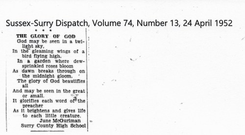 The first was in a Surry High School article and featured a poem written by my sister, June. I never knew she wrote poetry.