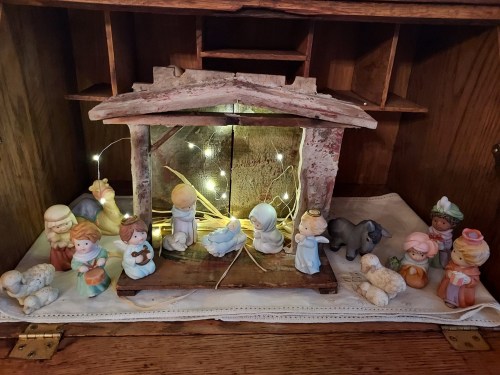 On a more serious note, although I kept the Christmas decorating simple this year, I did put out our nativity (Avon Heavenly Blessings from the 1980’s).