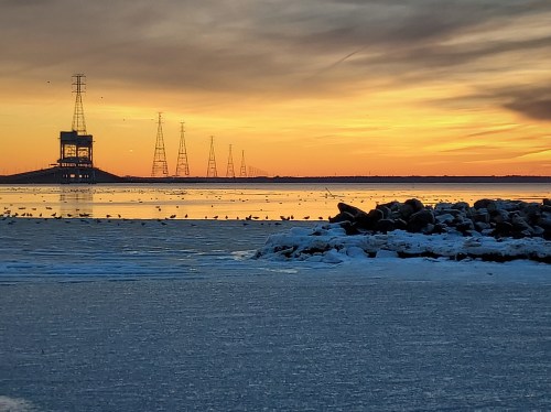 Monday evening, we’d been to dinner and on the way across the bridge, noticed ice (and probably some “foam”)  on the water’s edge on the Newport News side. Later, we were coming home around the time of sunset, and thought we may have a photo op.