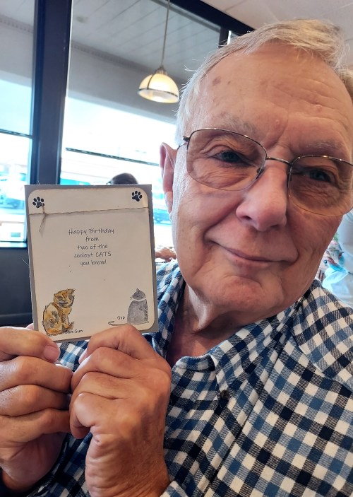 Since our kitties, Sundae and Gypsy, couldn’t ‘make it’ to the restaurant, they sent Motor Man a birthday card from the two of them. The inside verse: “Let’s get this pawty started”.