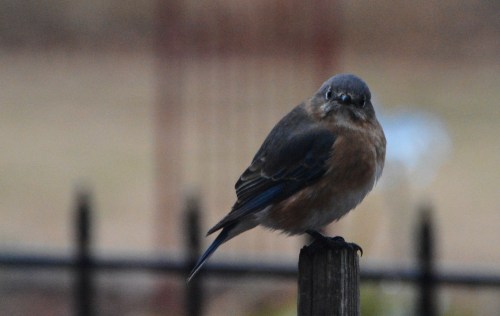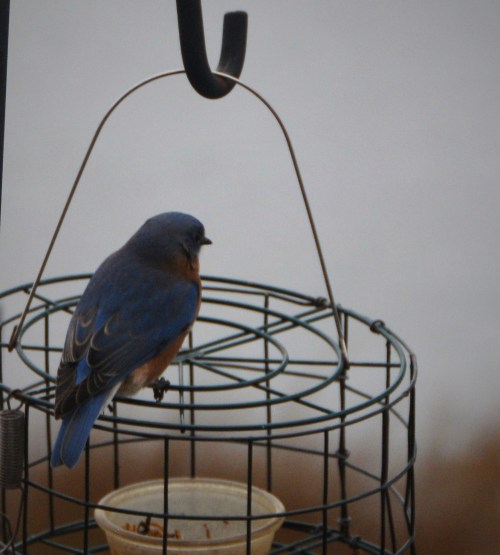 Occasionally, I’ll put some meal worms in this open feeder, but usually the larger birds empty it before the bluebirds have a chance.