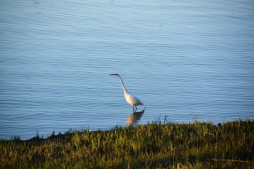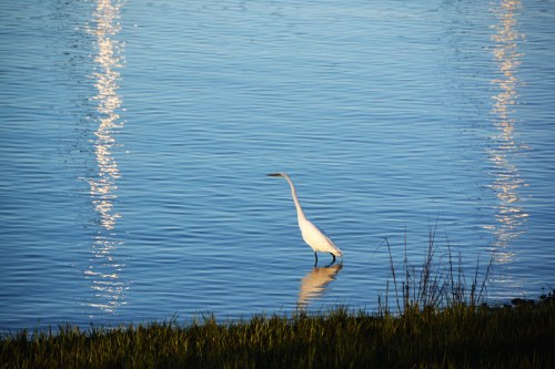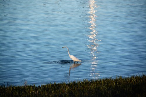 The setting sun had him in the spotlight. I kept watching, because I thought he was going to catch dinner. He dipped his beak in the water, but I think he came up short that time. He did make a pretty ripple in the water.