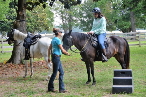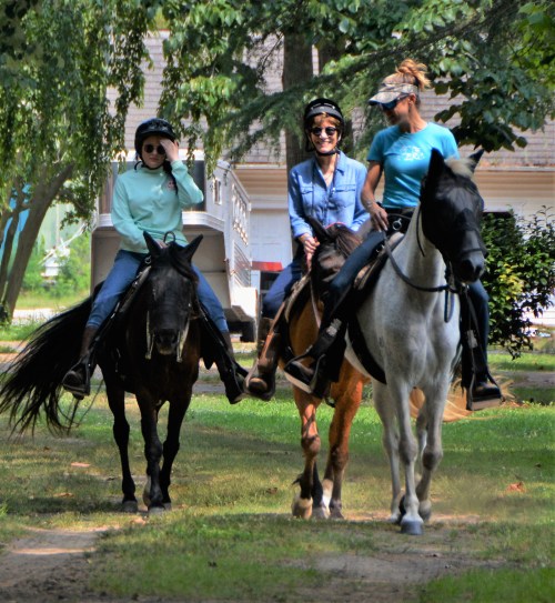 Staci rode Mateo, and in this picture, Elizabeth is making sure everything is right with her stirrups, etc. The white horse, Radar, was Elizabeth’s ride.