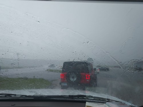 About an hour later, we  caught up with the storm in earnest.  It was probably the heaviest rain I can ever recall. Most drivers had their flashers on and were traveling about 30 miles per hour. Many of them (including us) were thankful to find a safe place to pull over and wait.