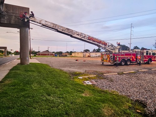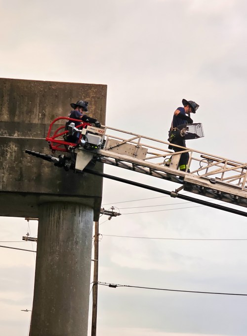 To the rescue. The firefighter reported that when he first approached her, she moved away from him, but then, when he reached out his hand toward her, she gave him a ‘head butt’.  He was then able to put her in the carrier.