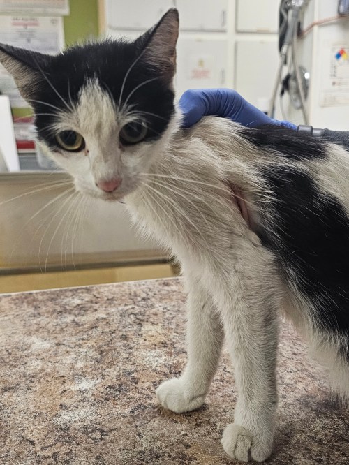 They discovered that the kitty was wearing a non-breakaway collar, and one of her hind legs had gotten caught in the collar. That had created a wound, which was infected. She was also dehydrated (who knows how long she’d been out there in this heat, rain, etc.) and emaciated, weighing barely three pounds.