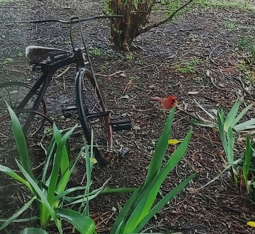 This morning, I happened to glance out of a window and saw this cardinal. When I first looked, he was perched on the handlebars of this little trike.