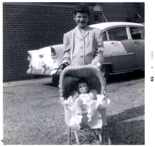 The doll baby was my Tiny Tears doll, which I still have. Her skin is crinkled in spots, but I’m happy to still have her, along with my Shirley Temple and Chatty Cathy dolls.  (I gave away my Barbies when I no longer played with them, and still regret that decision.)