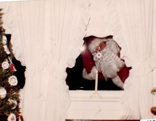 This photo was taken through our living room window when Marshall was three years old. (That’s a crocheted snowflake that I made hanging in the window in front of Santa’s face.)