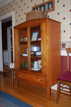 When Marshall’s dad and I married, Mom gave it to us. At that time, the finish was very dark, so we refinished it and exposed the beautiful woodgrain. I remember Mom reminding us to be very careful, because the glass in the doors was original. For a while after we refinished it, that aroma was gone, replaced by the smell of the products we used. And I missed that: that aroma was a big PART of my memories of that cabinet. Years later, I was glad that the wood smell had returned. When I open the doors, that aroma takes me back to my childhood in Grandma’s kitchen.