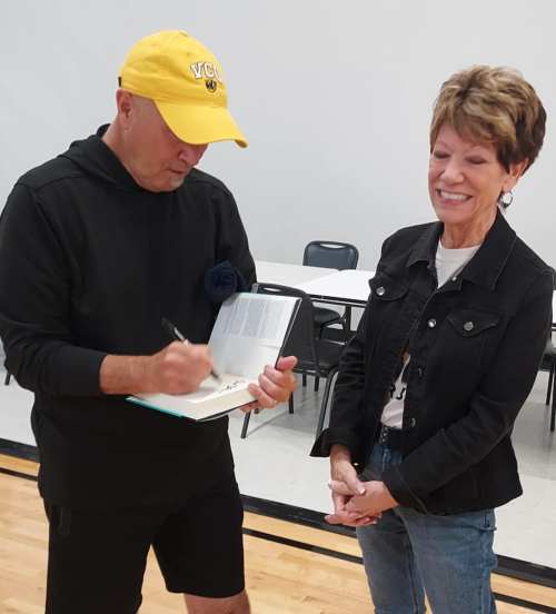 Last year, Mark’s memoir, The Boys And Me, was published, and I ordered a copy. After the show Friday night, those who had bought (or brought) books were able to have them signed. (Oops, I was caught mid-blink...)