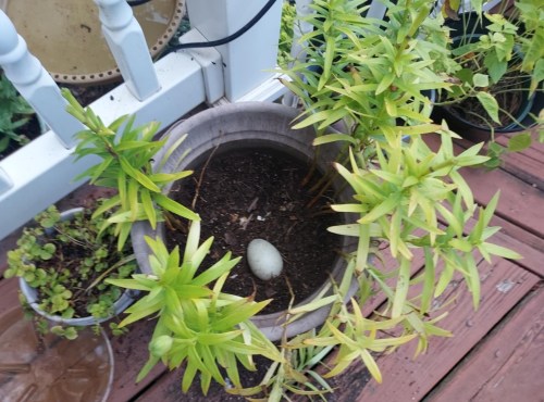 A few days ago, I noticed this (one) egg inside a potted plant on the deck, near the door.