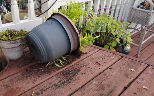 Since that time, I’ve seen several broken eggs around the yard. Yesterday morning, there were two broken ones on the deck, and the one in the flowerpot was no longer there.