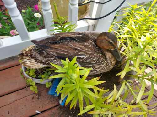 In the afternoon, I went out on the deck, and a female duck met me at the door. It was one of those nearly 100 degree days, so I gave her some water and corn. As I was going back inside, she did this:
