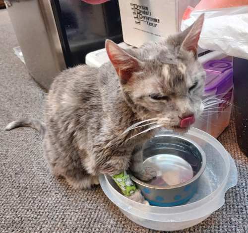 We picked her up around 3 in the afternoon, and she was very active in the carrier on the way to our shop (her home). Immediately upon our arrival, she went to her water bowl for a drink (and to soak her paw).