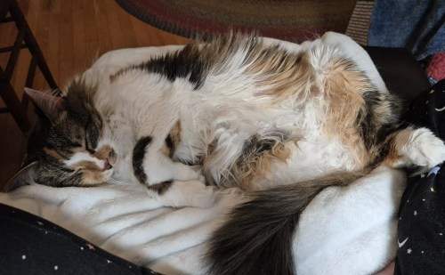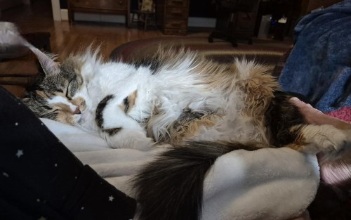 She read recently that, normally, when kitties are asleep, it’s a very light sleep. Only rarely are they in a deep, deep sleep.