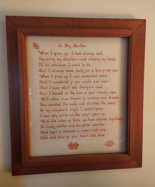 This counted cross stitch that I did for her ‘predates’ Marshall, and she had it proudly hanging in her den from the moment I gave it to her. When I saw this poem, I knew that it perfectly captured the relationship that she and I had. It was difficult to get a good picture of it, so I’ll share the poem below this photo. I don’t know who to give credit to for the poem; a Google search returned nothing. Obviously, the author felt the same way about her mom as I did about mine.