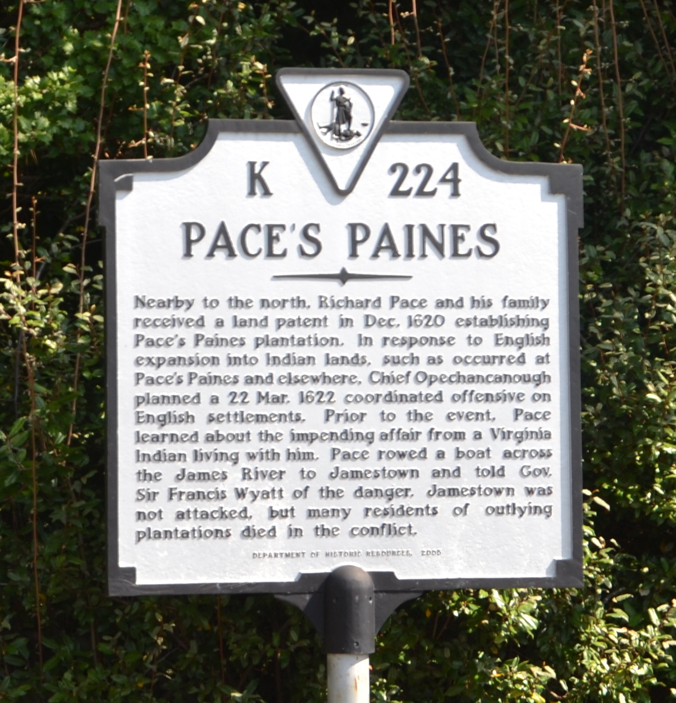 And a couple of memories I have of Virginia history relating to Pace’s Paines: the Indian who notified Richard Pace about the planned attack was named Chanco. I’m not sure why that fact was omitted from the sign.