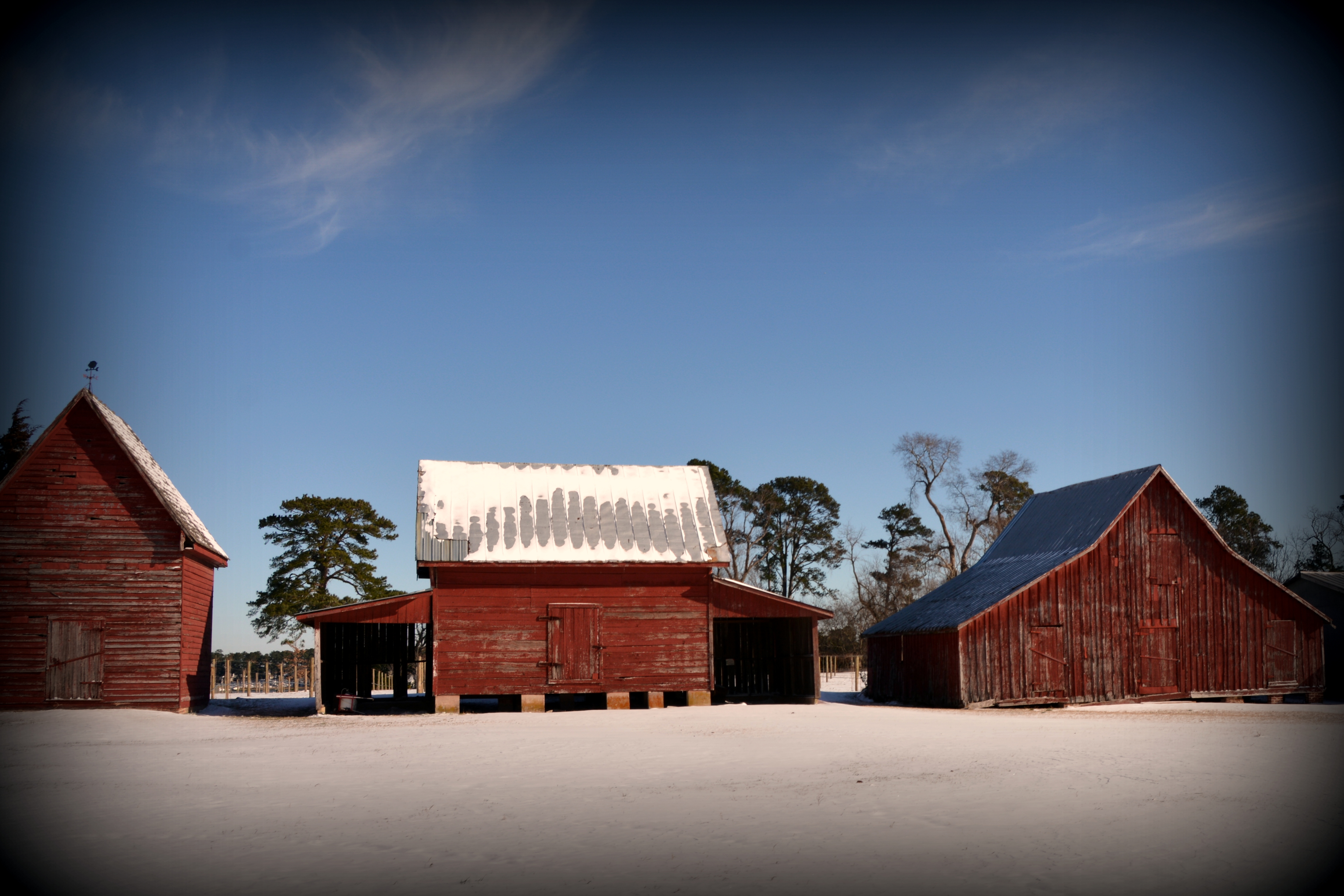A few weeks ago, Motor Man and I went riding after our first snowfall of the season, and I took this photo of some of those same barns. I added a little “vignette” frame and was pleased with the result.