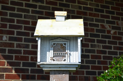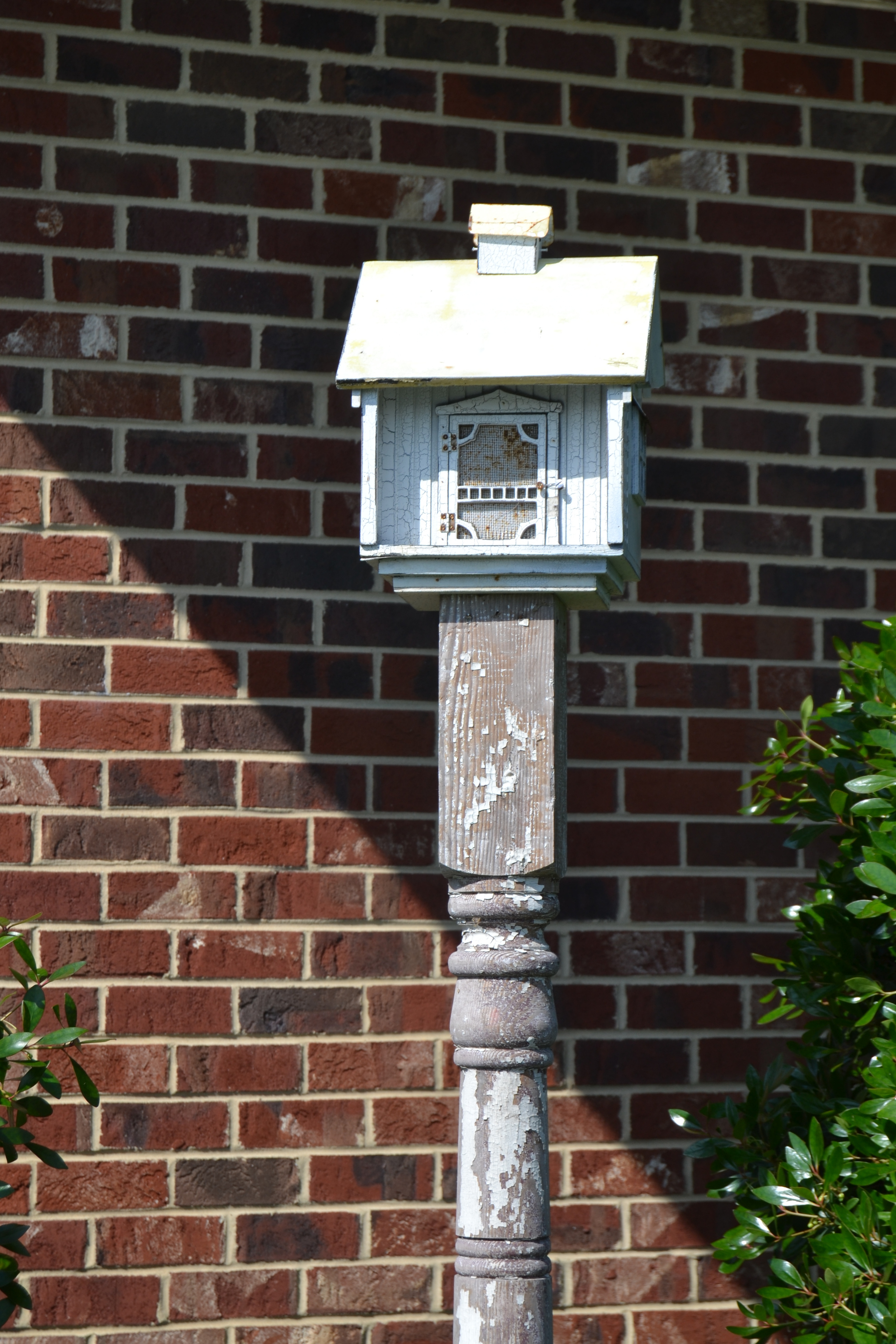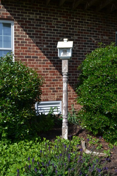 I searched for a long time for the perfect post on which to mount it. A few months ago, I found that at a little shabby chic shop on the Outer Banks. But I couldn’t decide on an exact location in our yard for the bird house, so it had remained unassembled.
