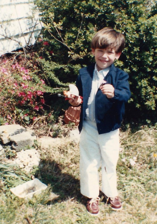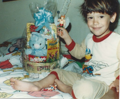 Sleepy-head checking out his basket, probably the Easter he was five. Once again, he’s holding a Super-hero figure. (That Super-hero fascination lasted for several years.)