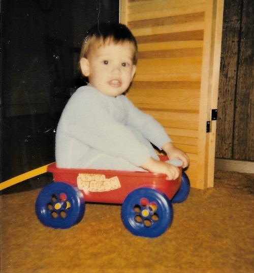 When Marshall came along, the Easter bunny brought him a basket each year. This was probably the spring he was nearly two. His Easter goodies that year were in this little wagon, which he soon determined was barely large enough for him to fit in.