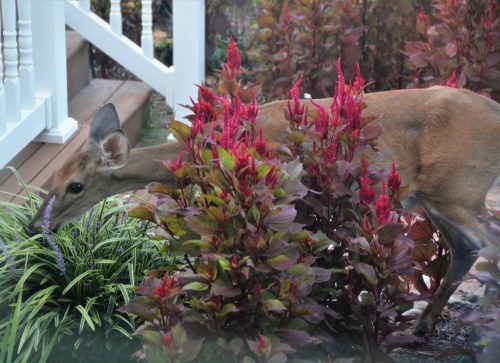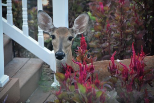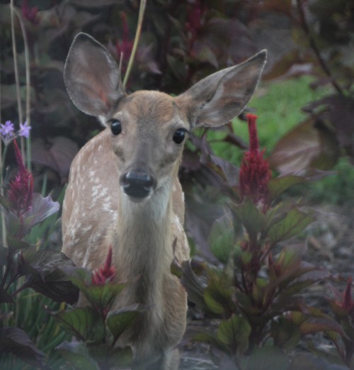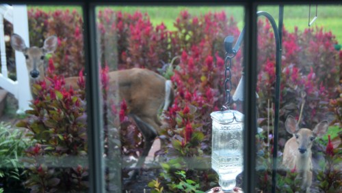 Last night, Motor Man alerted me to the fact that we had “supper” guests. You may have to study this picture closely: there’s a lot going on here. (I apologize for the reflections. I snapped this through our bedroom window.)  In it, Mama deer has been caught dining on my liriope. And did you see baby deer in the lower right corner of the picture, learning from her example?