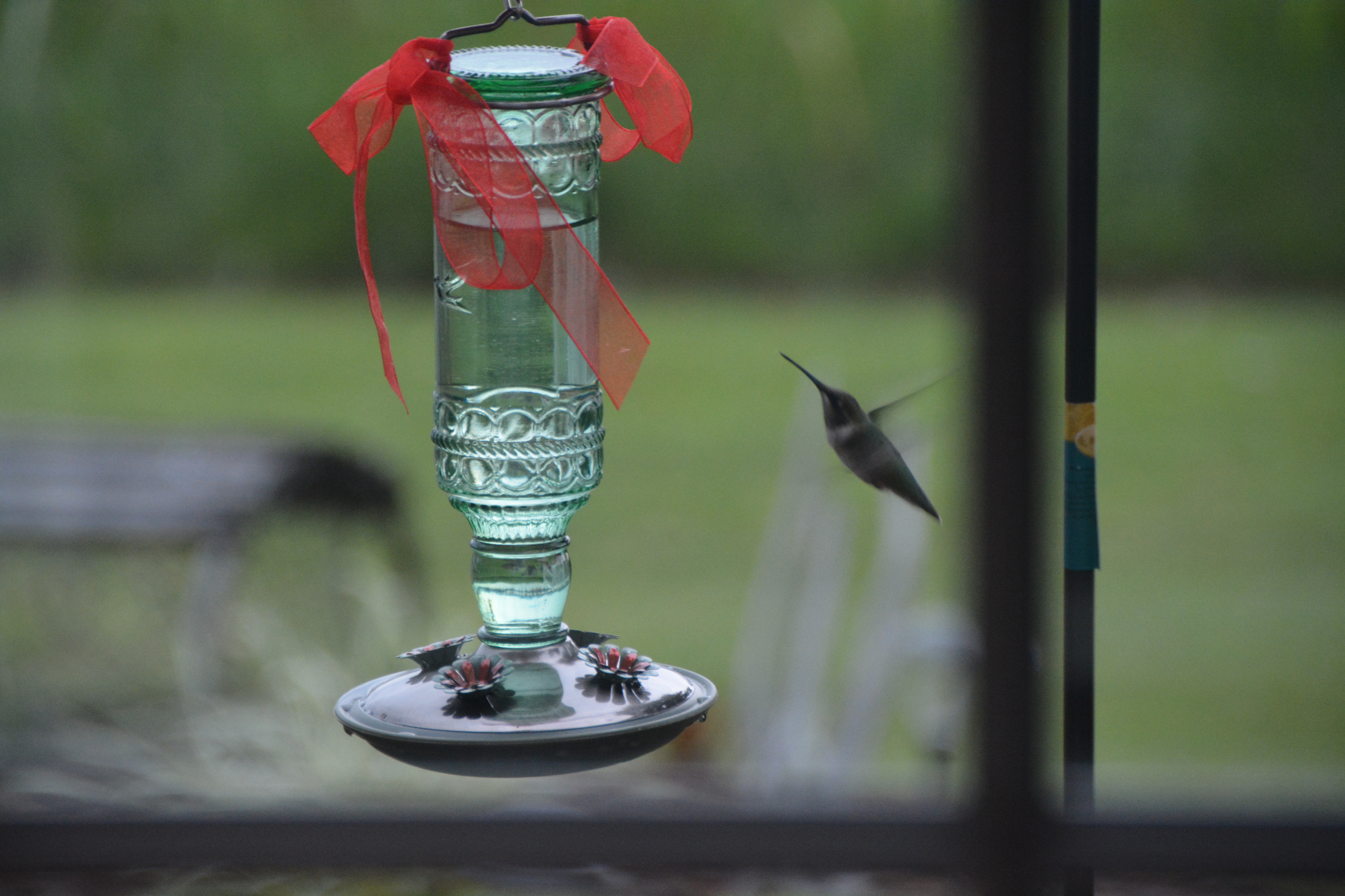 1.) Yesterday, we added one more “wild creature” to those who share our yard with us. It only took three weeks for a hummingbird to discover my feeder. I’m hoping he/she spreads the word to friends. (I read that hanging red ribbons on the feeder may help draw hummers. Since it was taking so long for them to find it, I really decked it out in red.)