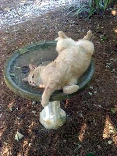 3.) Marshall recently sent me this picture of his kitty, Snugg, relaxing in the bird bath. Snugg is such a ham.