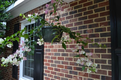 Earlier this spring, once again I bought two hanging geraniums for the front porch. They have, thankfully, remained vacant.  About three weeks ago, I saw this hanging bougainvilla at the nursery, and was unable to resist its beauty.