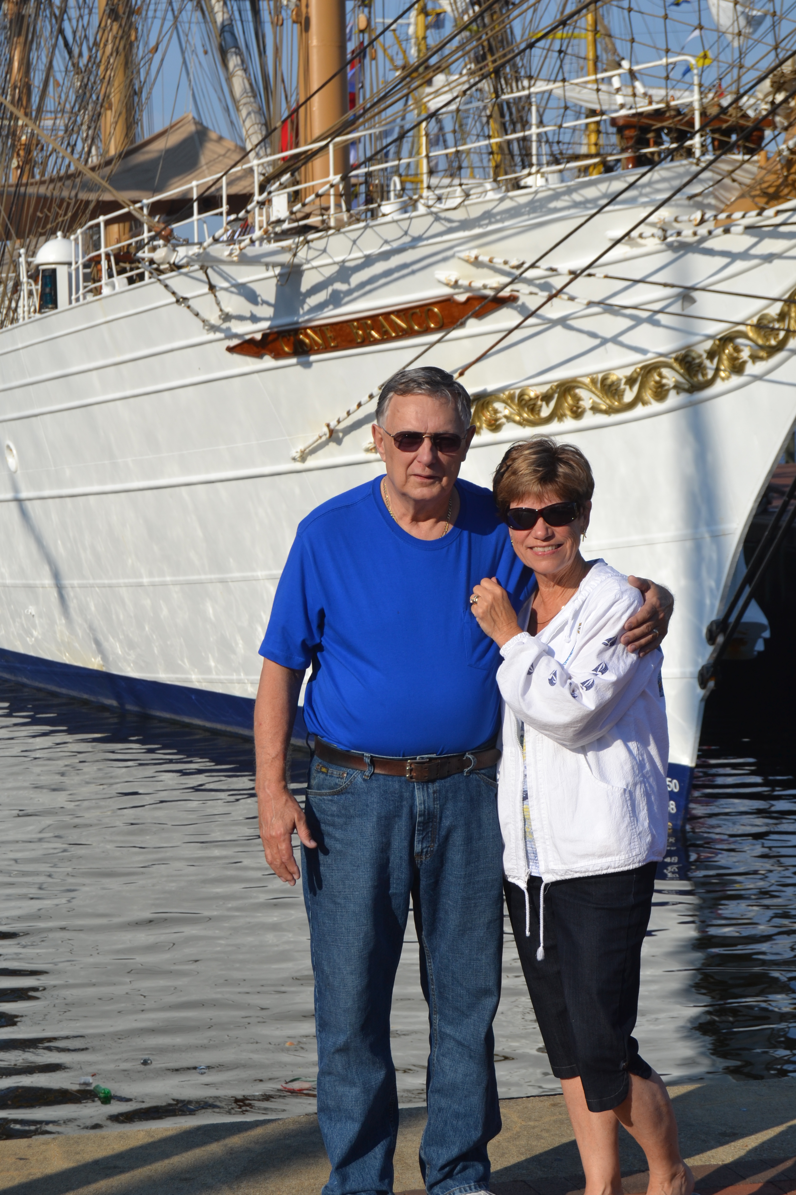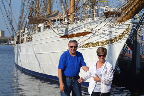 And Marshall took some photos of Motor Man and me in front of the Brazilian tall ship Cisne Branco. This one was taken when Motor Man was playing nice.