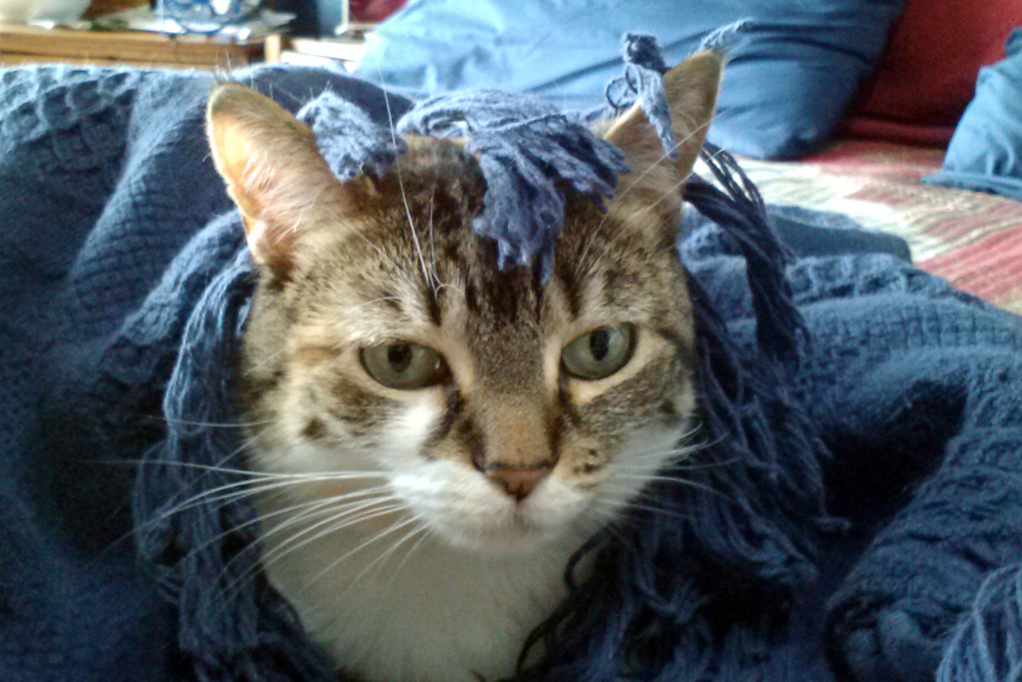 2.) I think I’ve mentioned before that Sundae has her own “blankie” and likes for us to put it over her. Earlier this week, we had done that, and a little later, Motor Man spotted this: she had started emerging from under the throw, then stopped, and was just lying there. We laughed at the fringe hanging over her head. She seemed completely unaware.