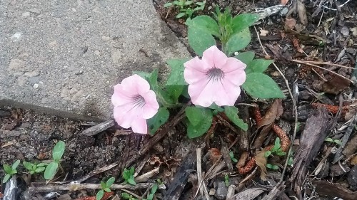 Last week, I was out puttering around in the flowerbed, pulling weeds and checking on the few perennials I have (dianthus, vinca, Sweet Williams, salvia). Then, just a few feet from where Petunia used to live and grow and be beautiful, something caught my eye. It sure looked like petunia foliage. Could it be?