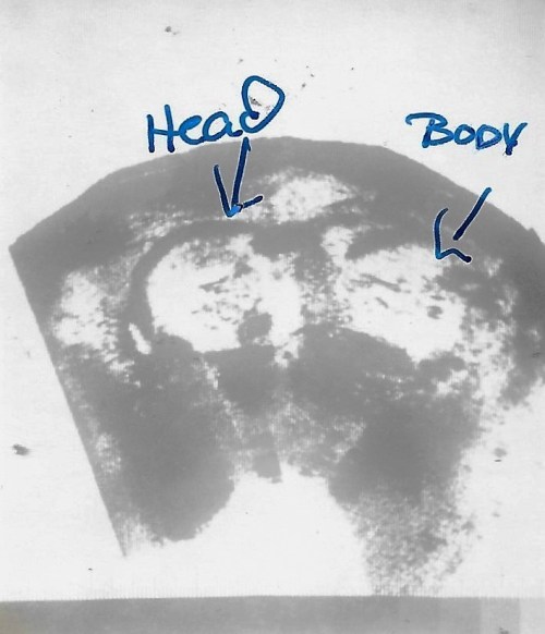Now, when one of my young soon-to-be-a-parent friends shares an ultrasound image on Facebook, you can almost tell which side of the family the baby will ‘favor’. This was Marshall’s ultrasound, with the nurse’s handwritten note denoting the head and the body. (But I was sure excited to have this photo.)