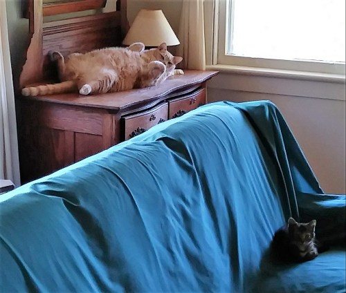 Marshall also shared this picture with me.  That’s Snugg putting on a show on the dresser, while Sibby is just looking tiny on the sofa.