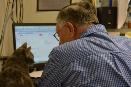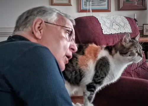 Hi, efurryone!  This is Sundae, wishing Motor Man a wonderful birthday!  He’s such a smart man: when I first adopted my pawrents and came to live with them, I cried for several days. Motor Mommy was almost at the end of her rope, but Motor Man just said: “We don’t know how long she’s been living in that little cage. Now she has a whole house to explore and get accustomed to.  She’ll be fine.”  And he was right!  Motor Mommy took this picture of us Christmas Day.  Motor Man was asking me what had my attention out the window.