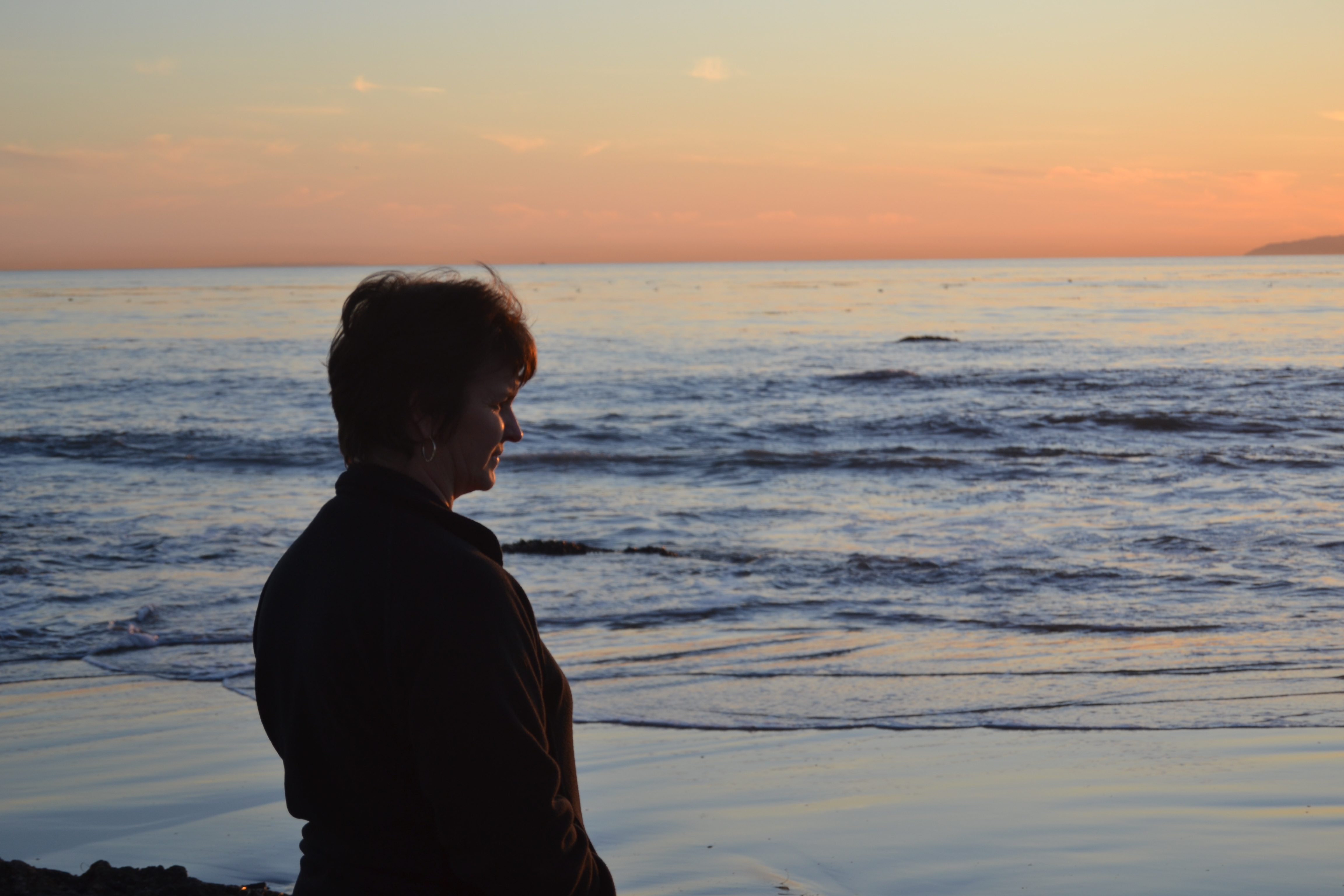 This next photo is yet another favorite. It was taken of Bev at sunset at Crystal Cove on our last evening in California. Wonder what she was thinking…