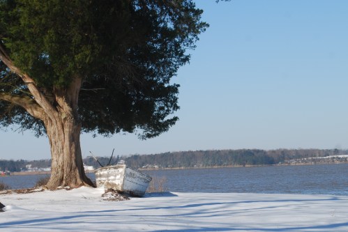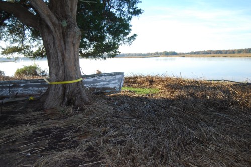 And a particularly wicked nor’easter in 2009. Motor Man ratcheted the boat to the cedar tree in advance of the storm. Notice how much the wind and waves moved the boat. Not to mention all that debris that had to be hauled away. This picture was taken from the same angle as the previous two.